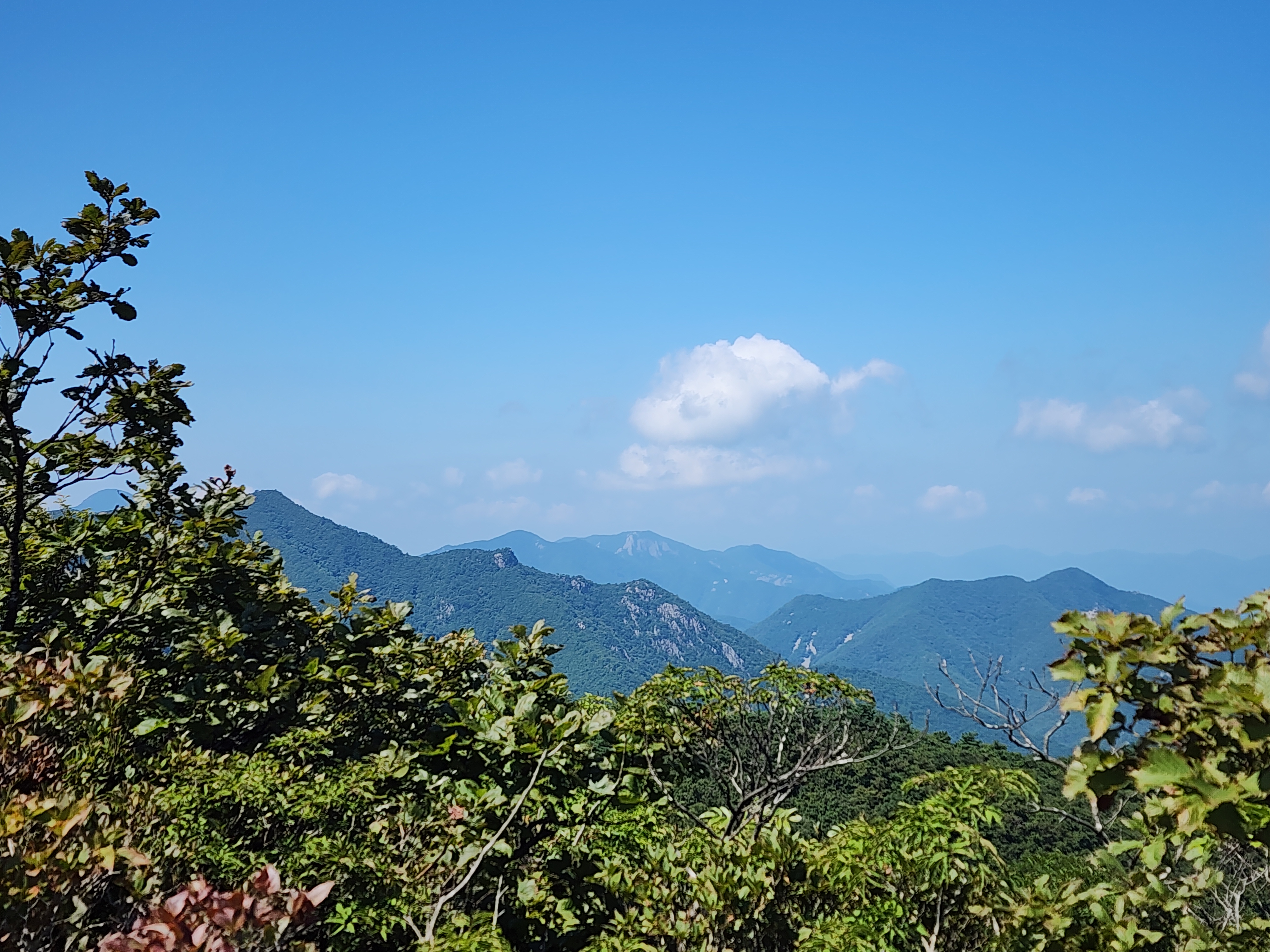 처음으로 조망이 터졌다. 앞 봉우리가 지나온 신원봉인듯하다. 멀리 뒤로 고헌산이 보인다