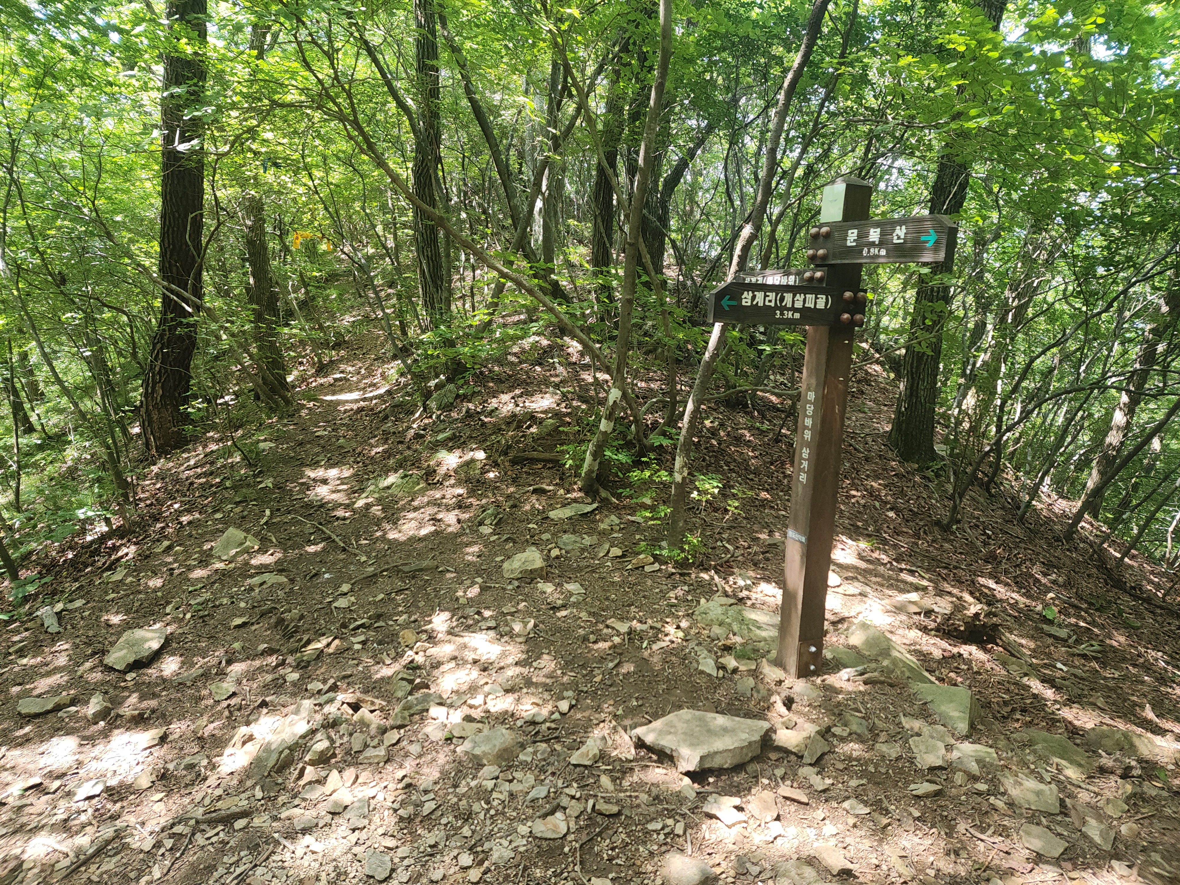 삼계리(계살피계곡)갈림길이다. 여기서 마당바위와 하늘문바위를 보기위해 내려갔다 되돌아 와야 한다. 마당바위 0.3Km