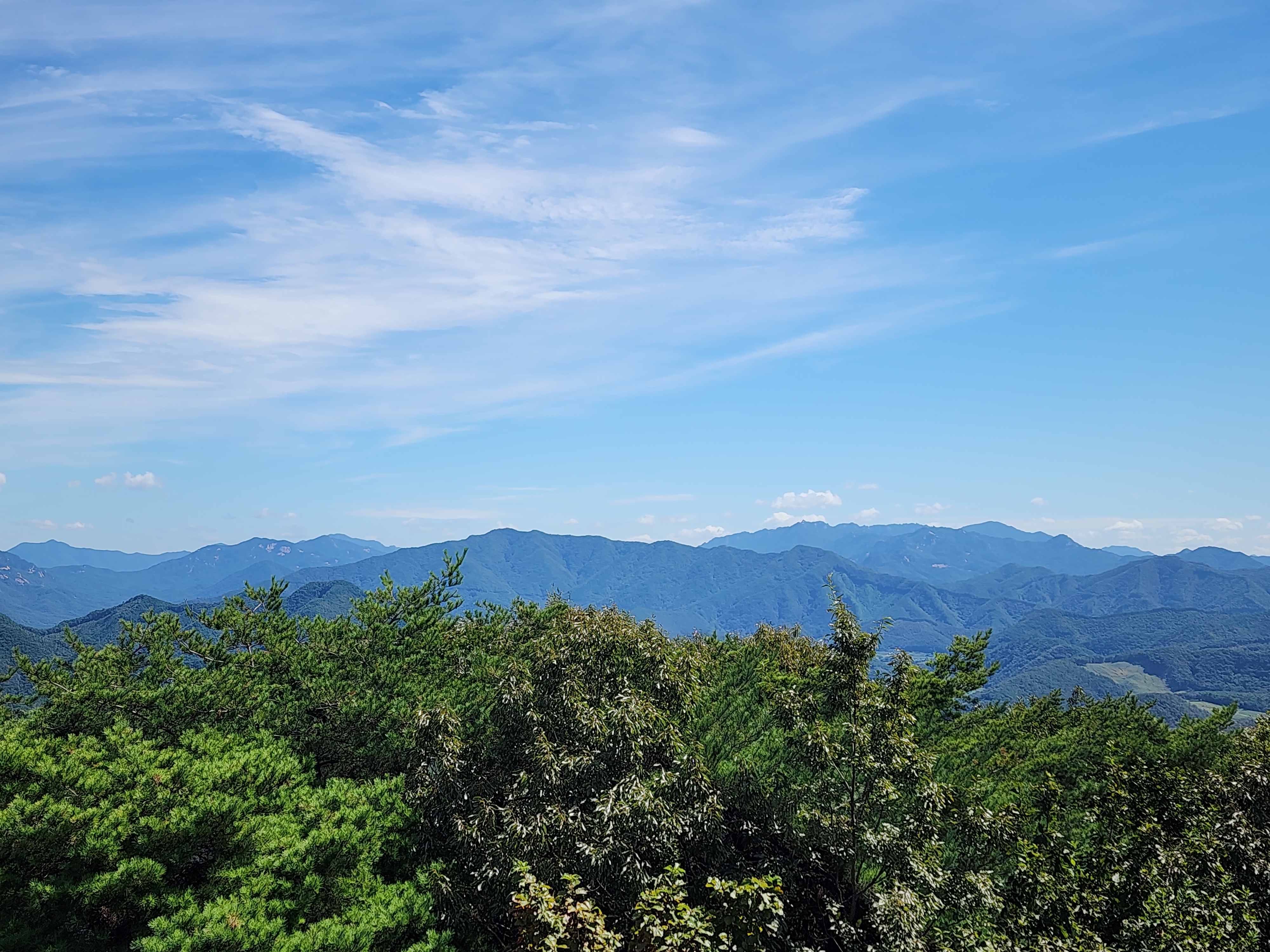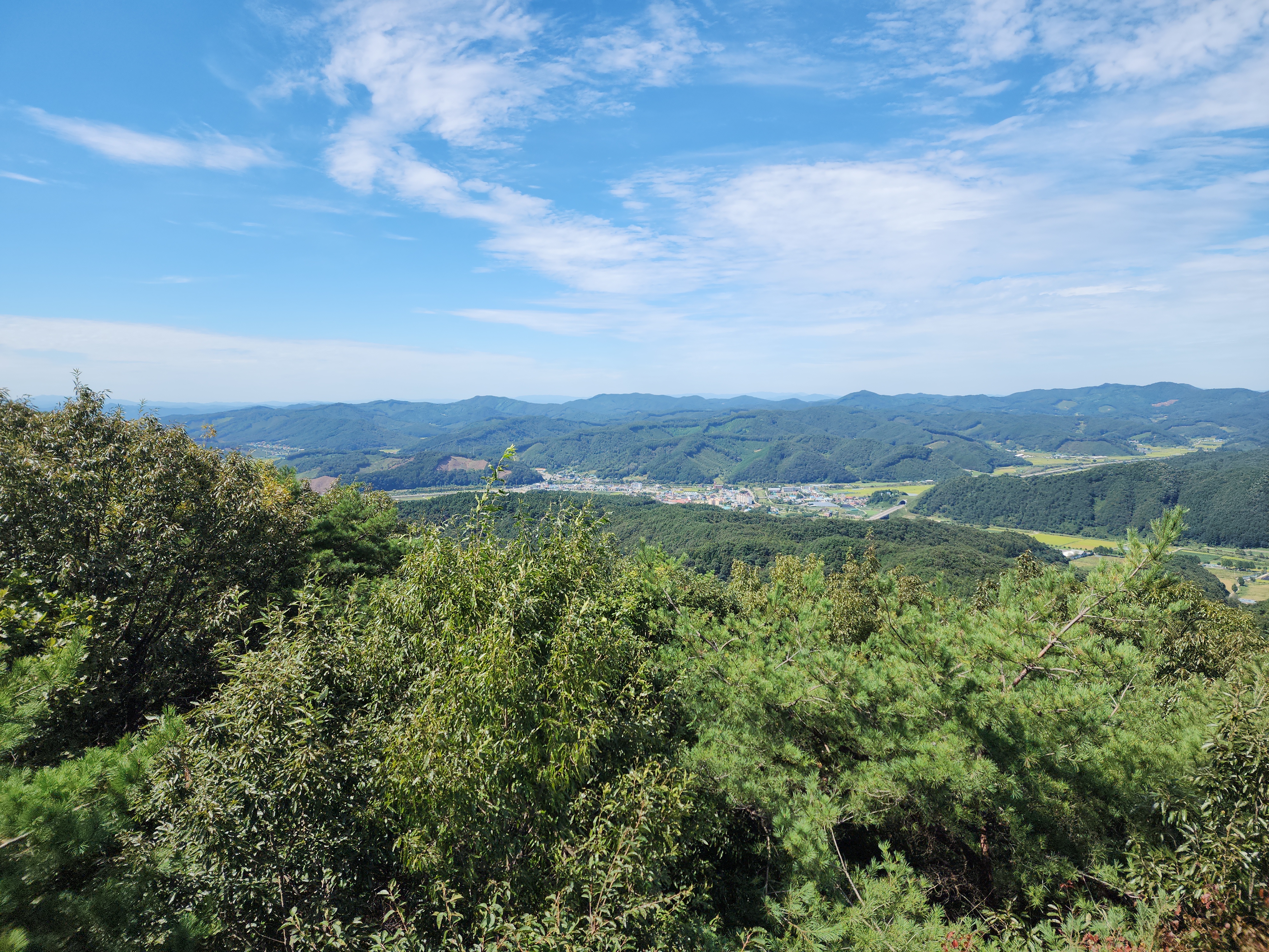 멀리 속리산의 하늘금이 보인다