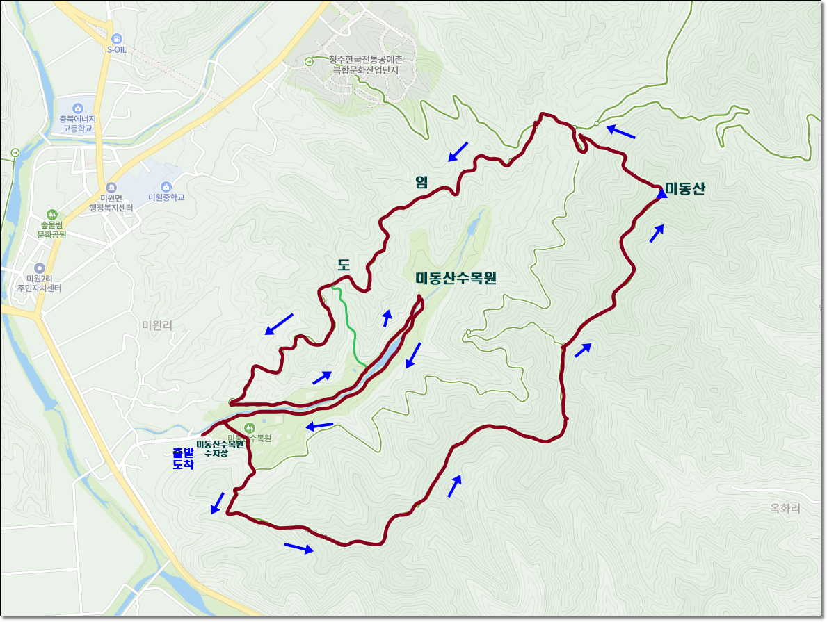 미동산수목원주차장 - 미동산 - 미동산쉼터 - 임도 - 목재체험관갈림길 - 임도 - 수목원입구 - 미동산수목원돌아보기 - 주차장